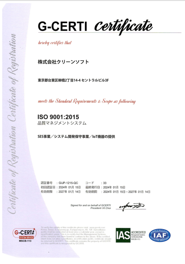 当社は、2024年1月15日付けで、QMS(Quality Management System:品質マネジメントシステム)の国際規格である「ISO9001:2015」を取得しましたので、お知らせいたします。