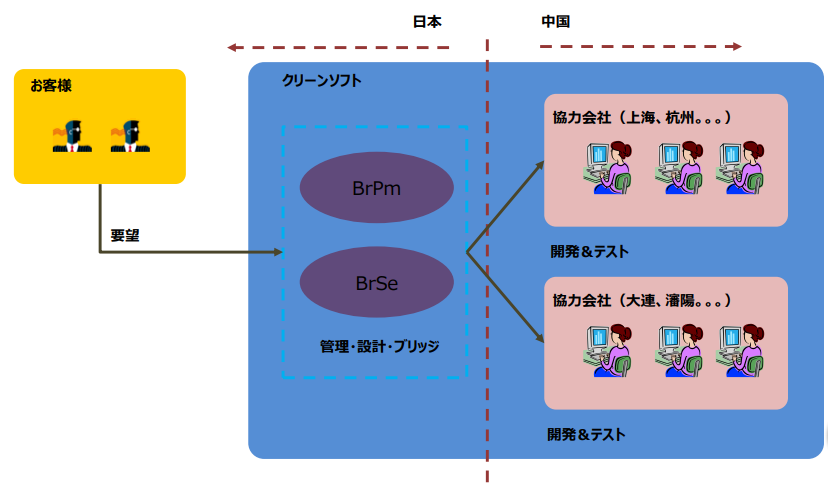 日本国内に弊社のブリッジPM及びブリッジSEがおりますのでオフショア先の開発における管理が可能です。